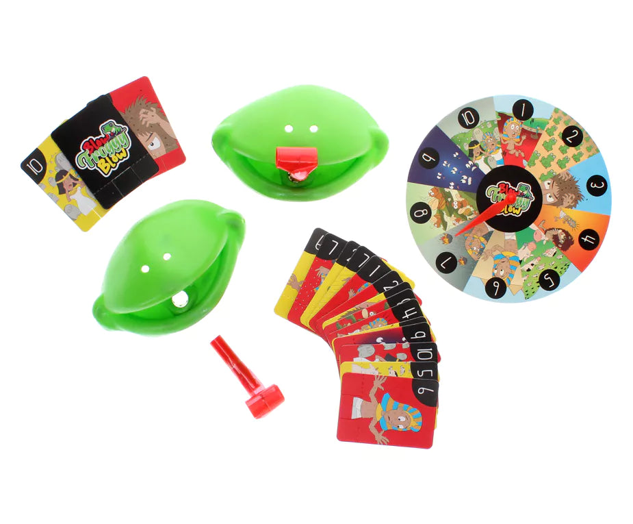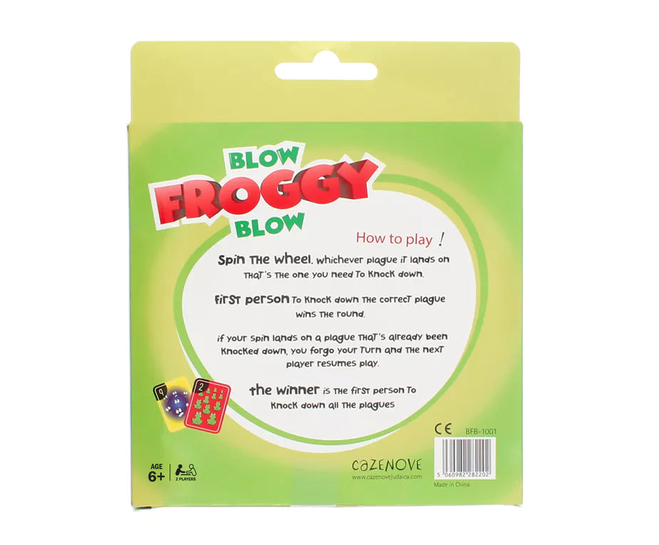 This game of Blow Froggy Blow is sure to entertain the kids this Passover. Simply spin the wheel, whichever plague it lands on that's the one you need to knock down. First person to knock down the correct plague wins the round. If your spin lands on a plague that's already been knocked down, you forgo your turn and then the next player resumes play. The winner is the first person to knock down all the plagues.