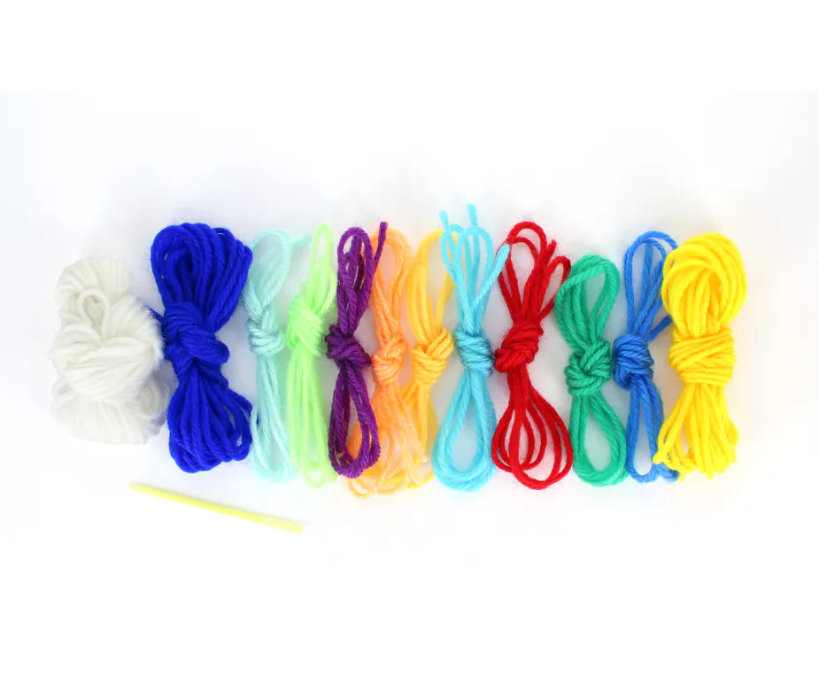 Chanukah Menorah Cross Stitch Kit. Kit includes threads, embroidery board, plastic needle and colour guide. This is a lovely, activity for children to produce a bright, fun Chanukah picture. A great way to get children started with cross stitch and sewing in general. The components inside this box are: 12 coloured threads, 1 cross stitch board, 1 plastic needle and pattern guide. Suitable for children of 6+ years of age.