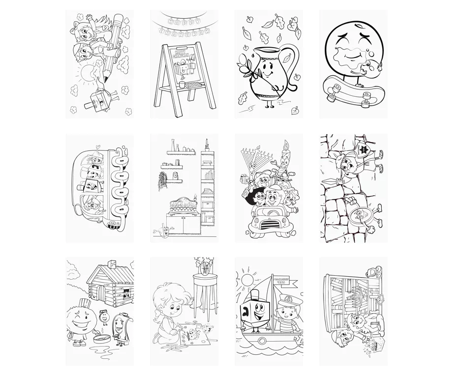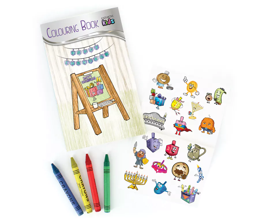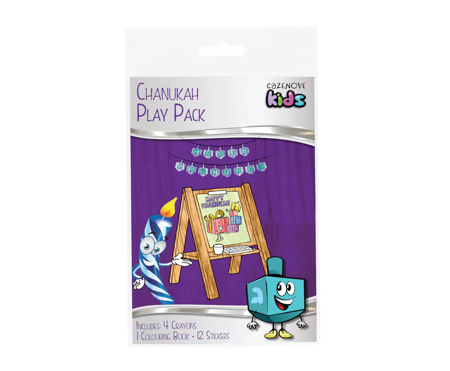 This Chanukah play pack is the perfect gift for any child. It includes 1 colouring book, 1 sheet of stickers and 4 crayons to make the images come to life. Great for play, education, and Chanukah parties... etc.