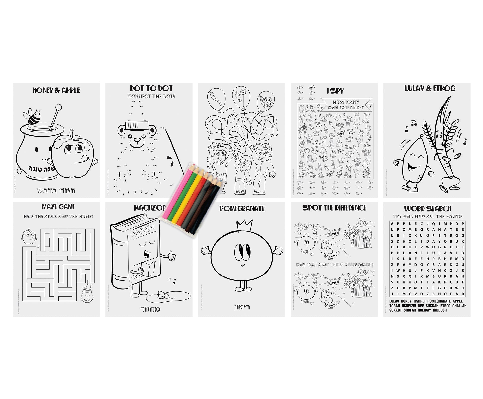 This New Year & Sukkot Activity Set is the perfect gift for any child. It includes 4 New Year & Sukkot themed coloring sheets as well as 6 activity sheets. Comes with 7 coloring pencils to make the set come to life. Great for play, education, birthday parties... etc.