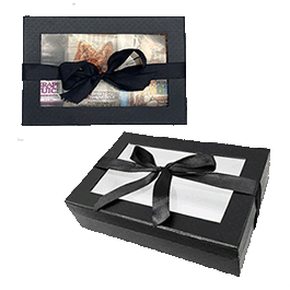 This box features a clear window lid on top of the box and coordinating grosgrain ribbon closure.
