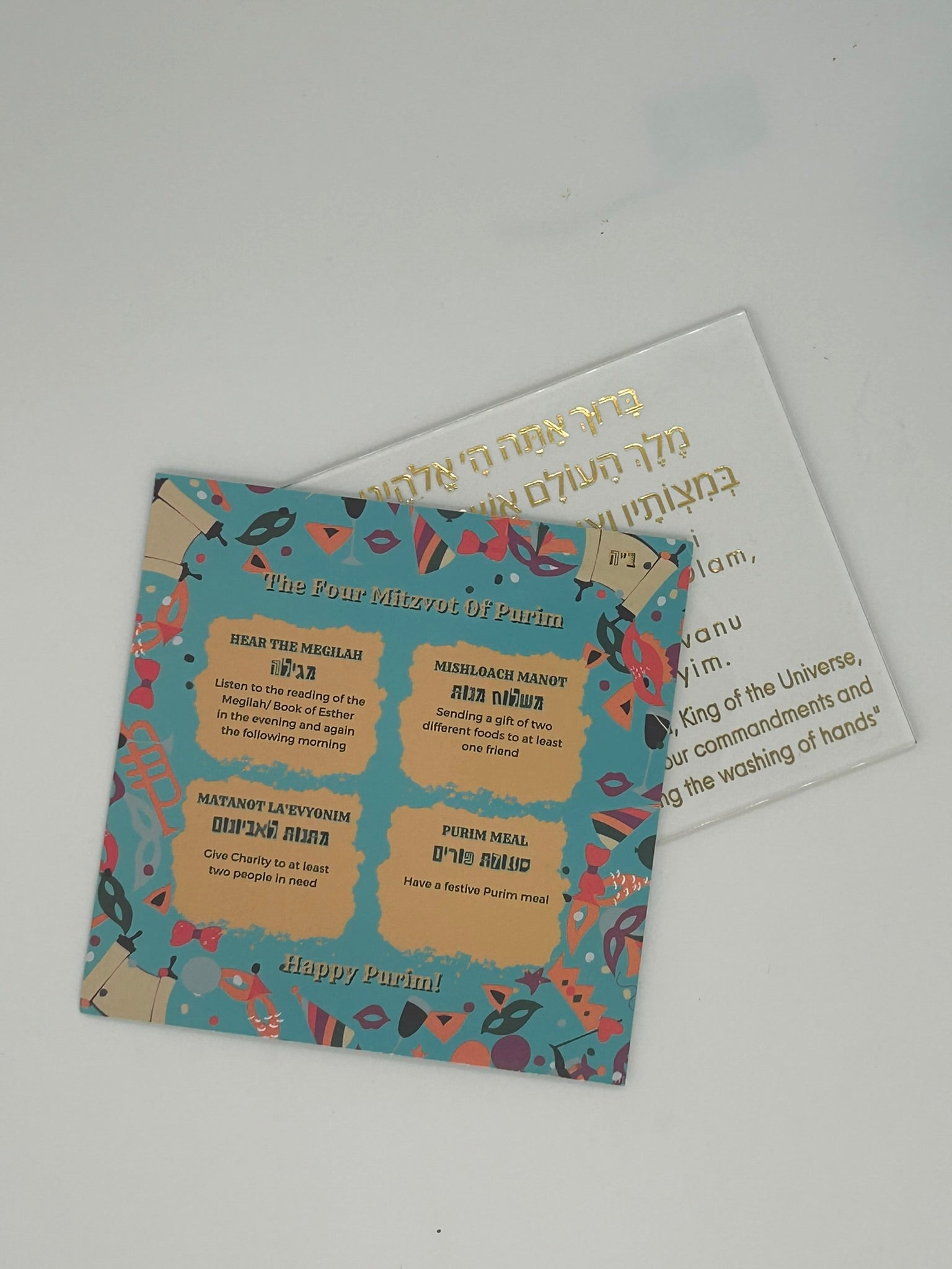 - Educational Card: One side explains the 4 Mitzvos of Purim, while the other highlights the mitzvah of washing.