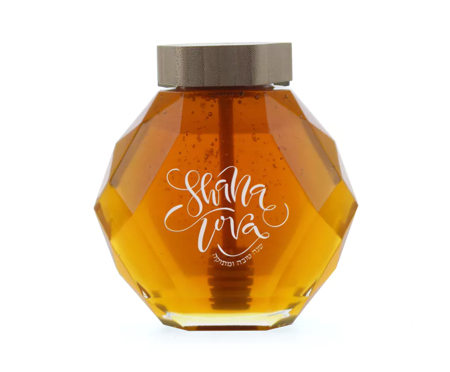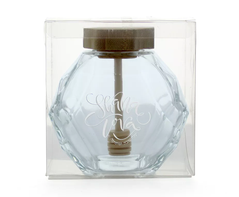 This beautiful glass hexagon honey jar Inscribed with the wording Shana Tova in both English and Hebrew is perfect for Rosh Hashanah. Attached to the wooden lid is the honey dipper making this the ideal gift to start a Happy & Sweet New Year