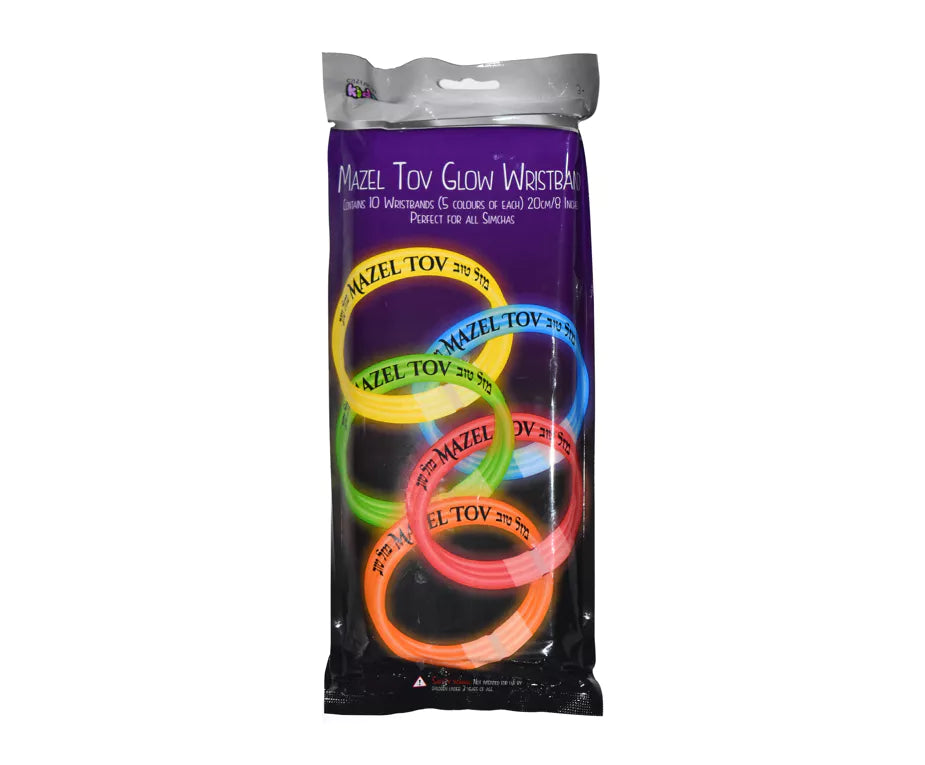 Pack of 10 Mazel Tov glow in the dark wrist bands.