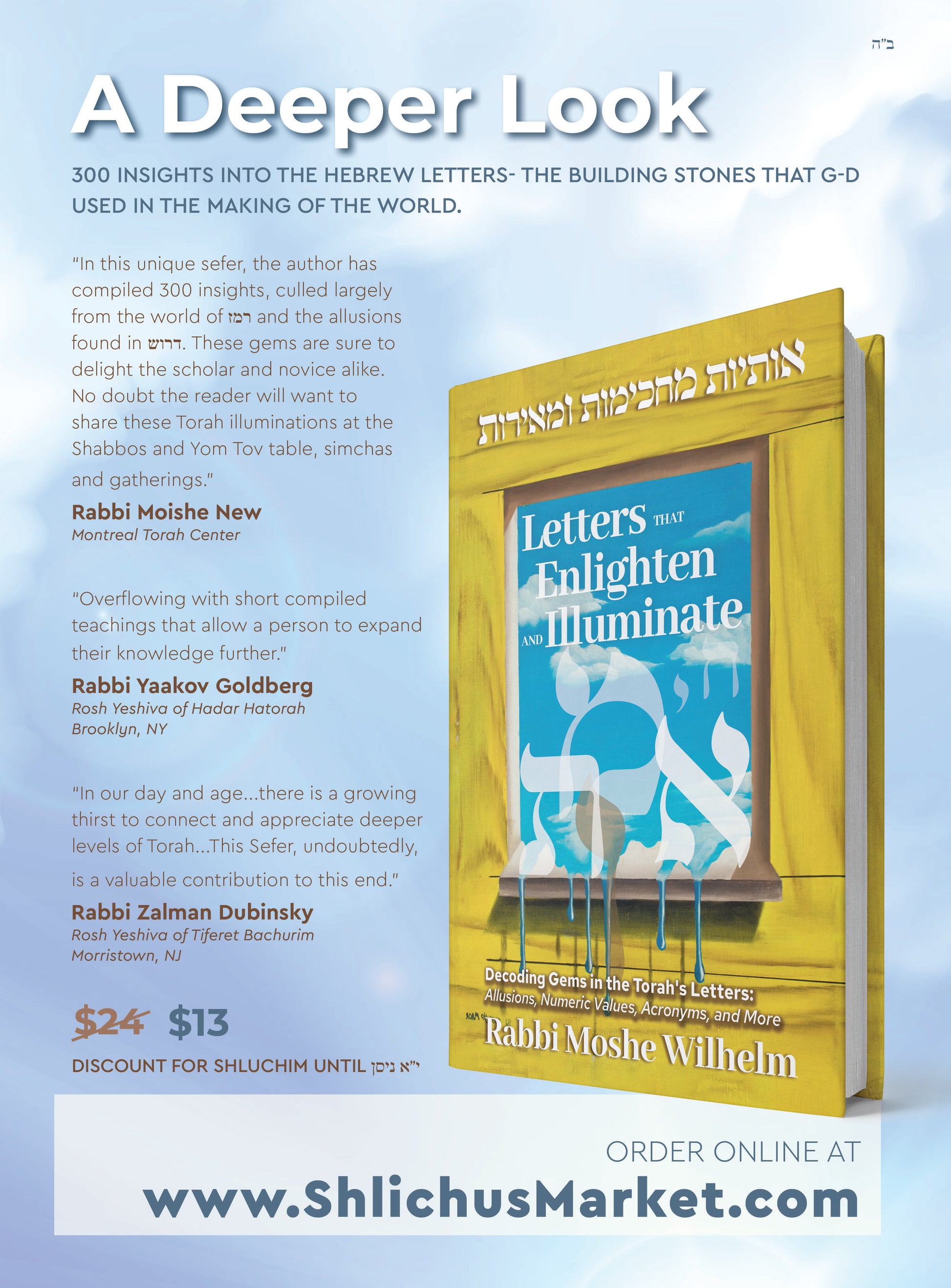 No doubt the reader will want to share these Torah illuminations at the Shabbos and Yom Tov table, Simchas and gatherings.