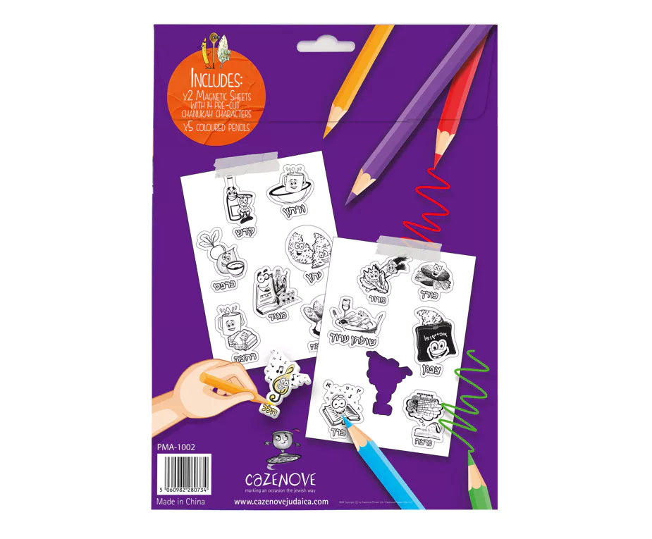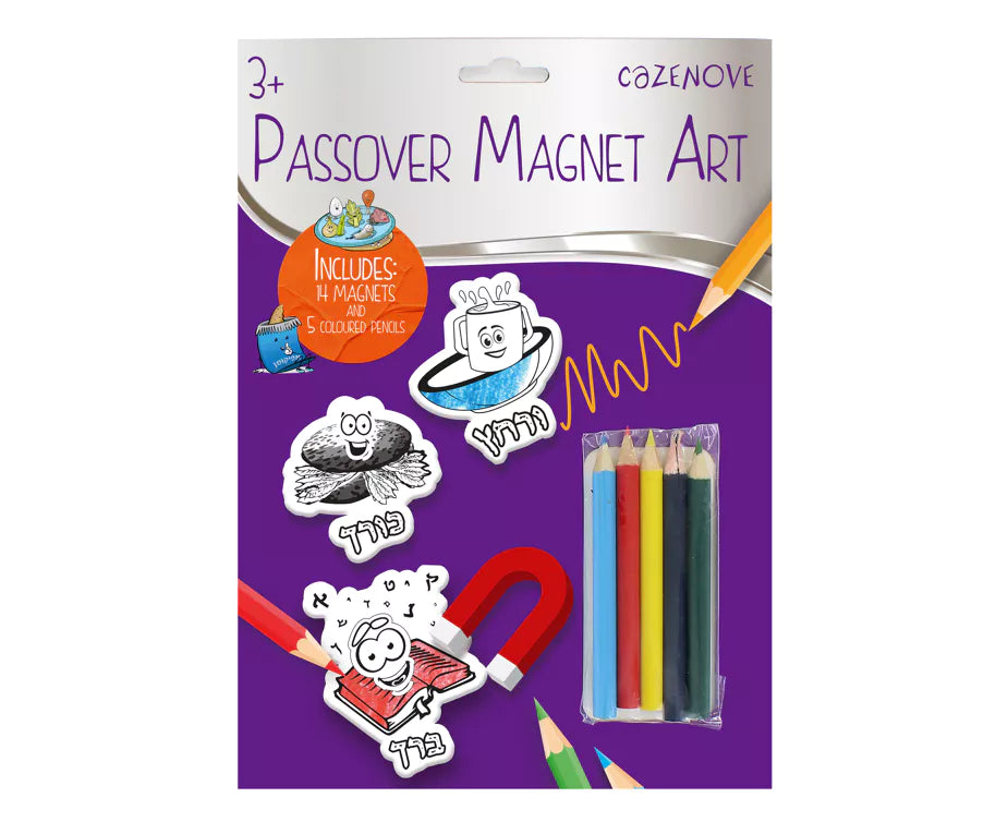 A great activity for children this Passover to make their own Passover themed magnets. Colour in and push out any of the 14 pre-cut Passover characters to brighten up any fridge / magnet surface this Passover. Pack includes two A5 magnetic sheets and five coloured pencils.