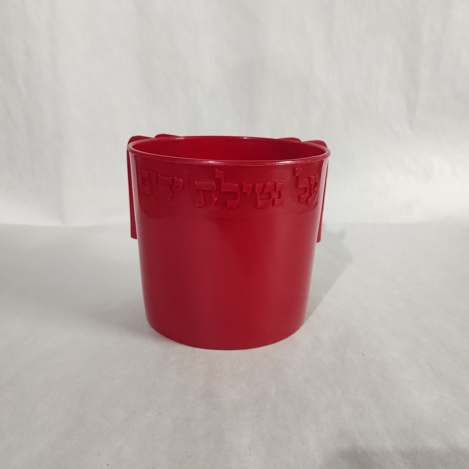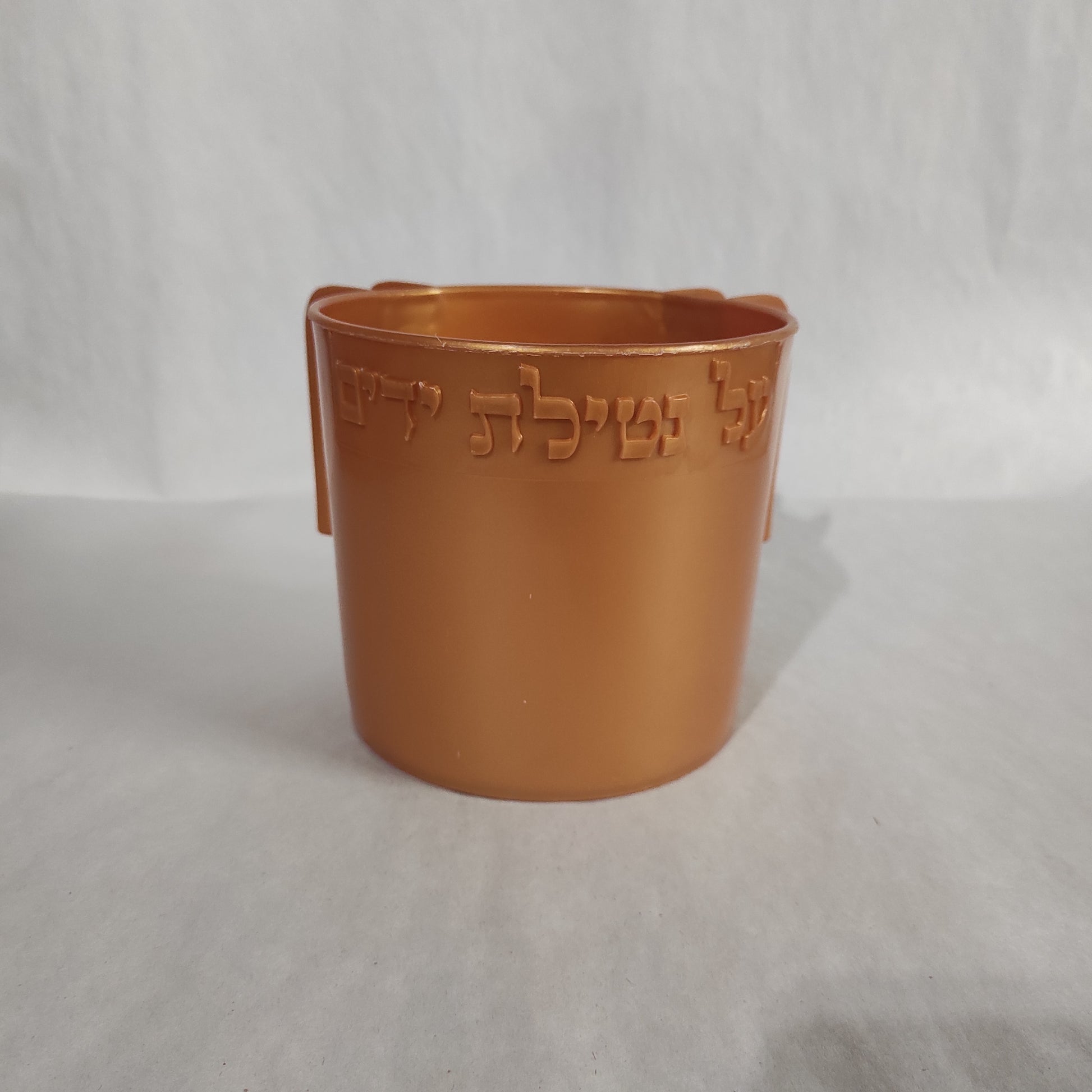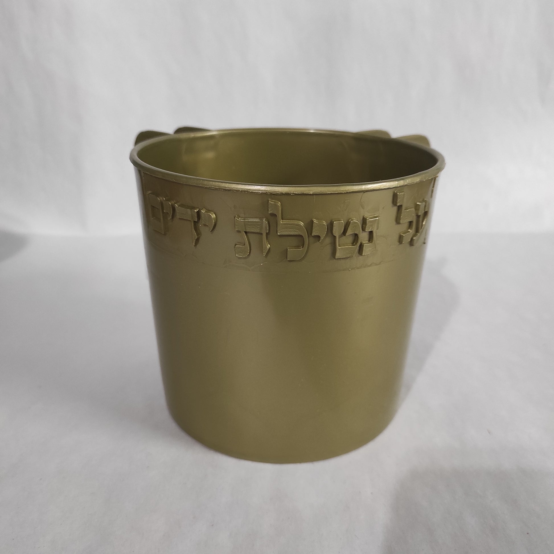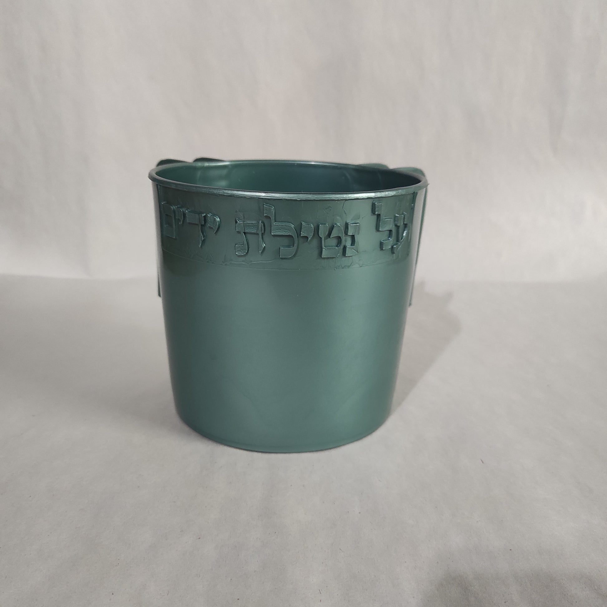 Judaica Wash Cup is designed with dual handles and embossed with the words "על נטילת ידים".