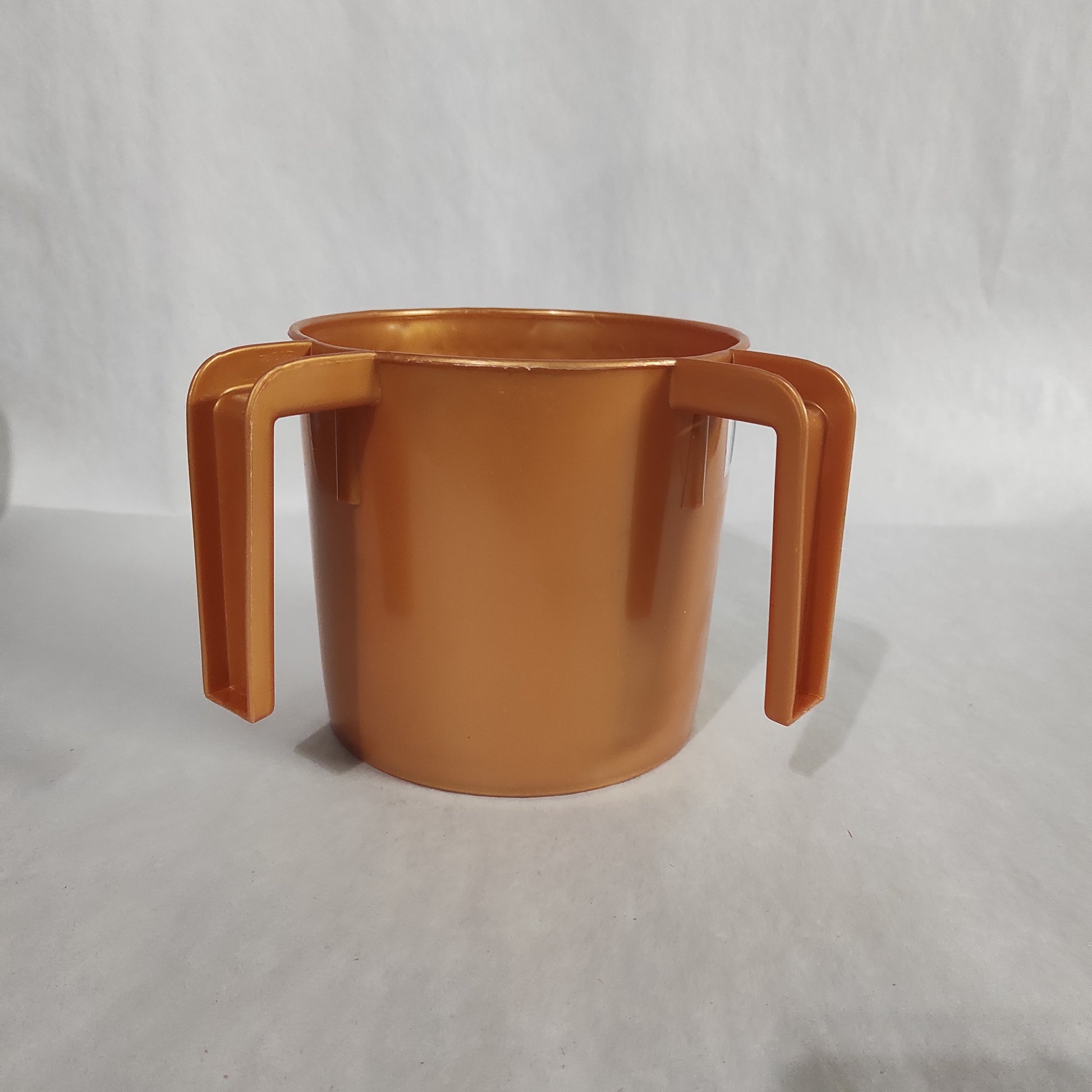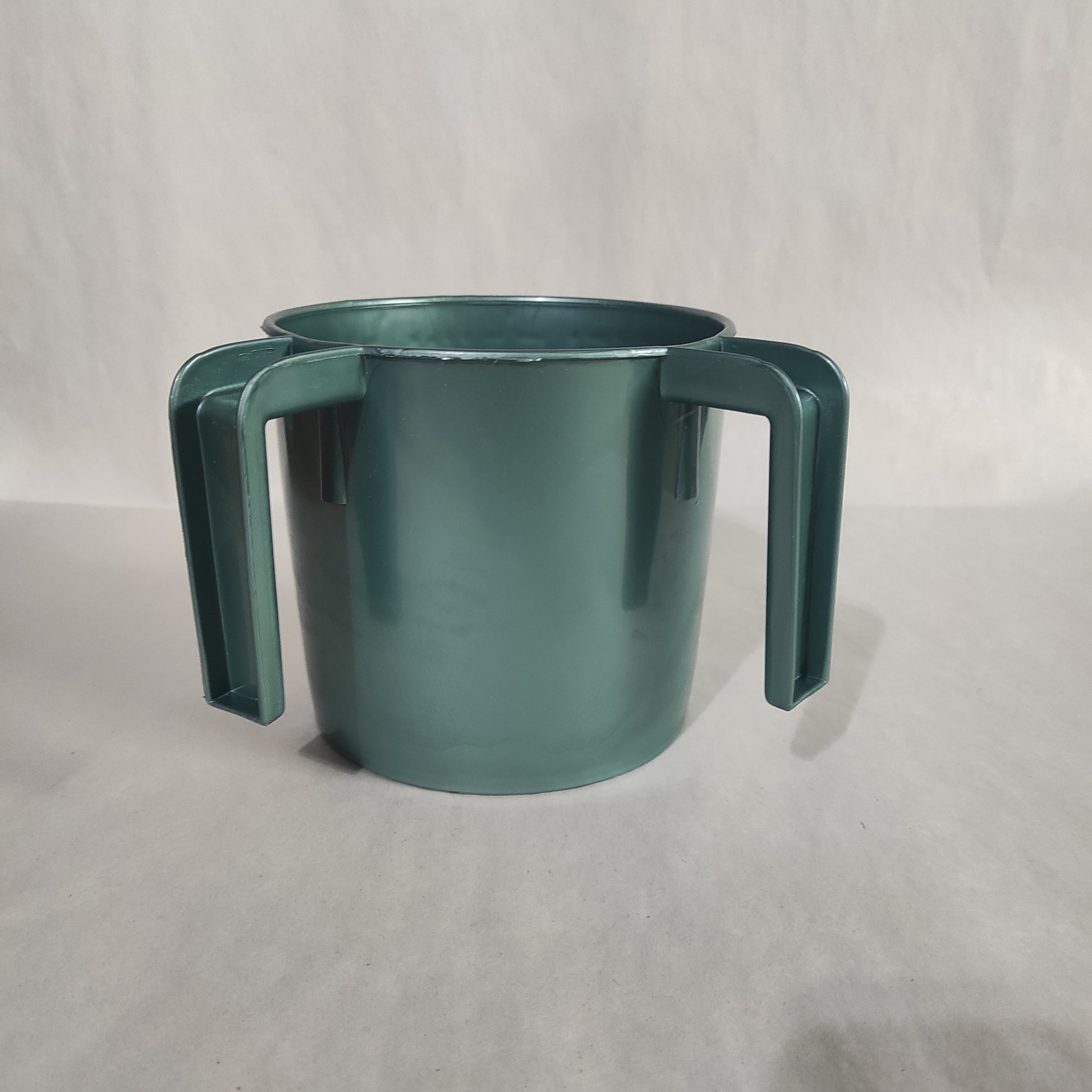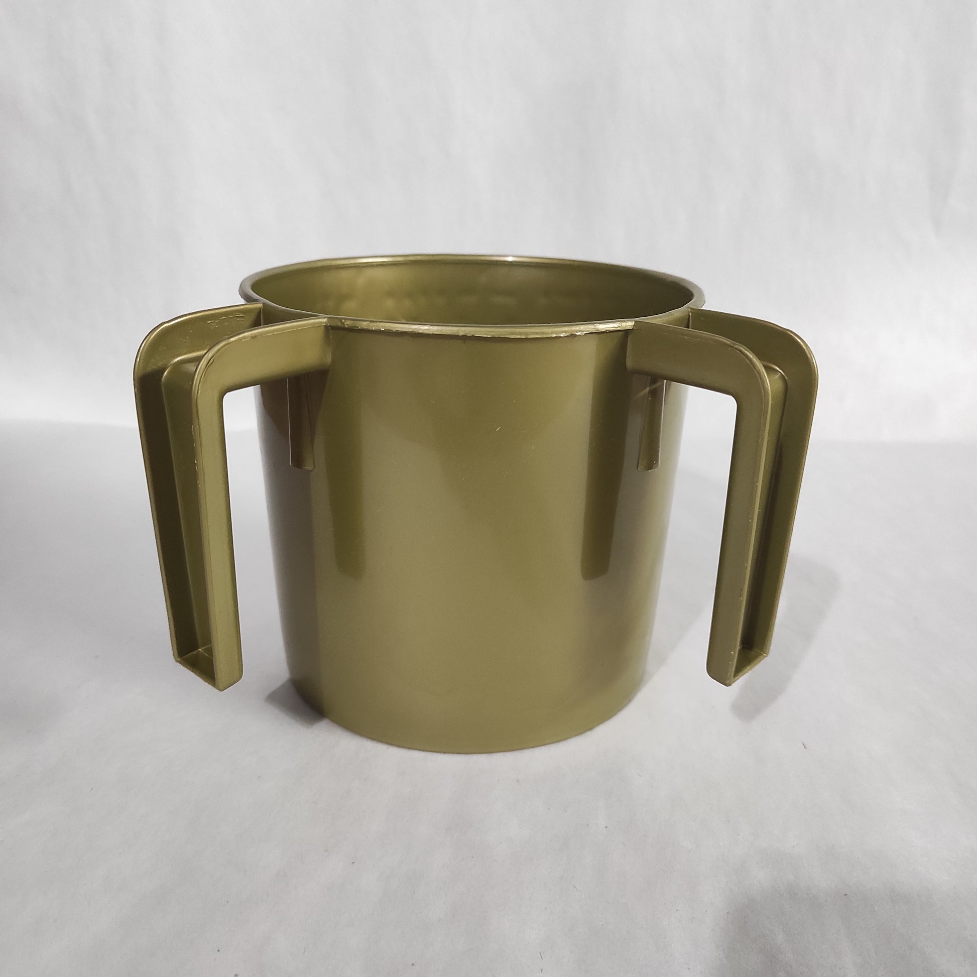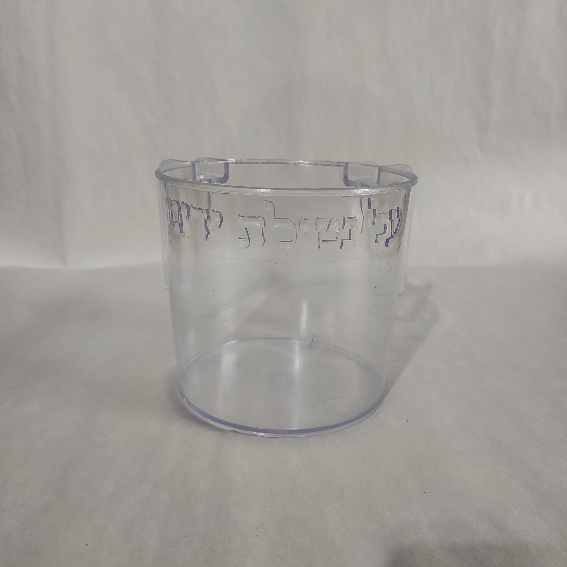 Judaica Wash Cup is designed with dual handles and embossed with the words "על נטילת ידים".
