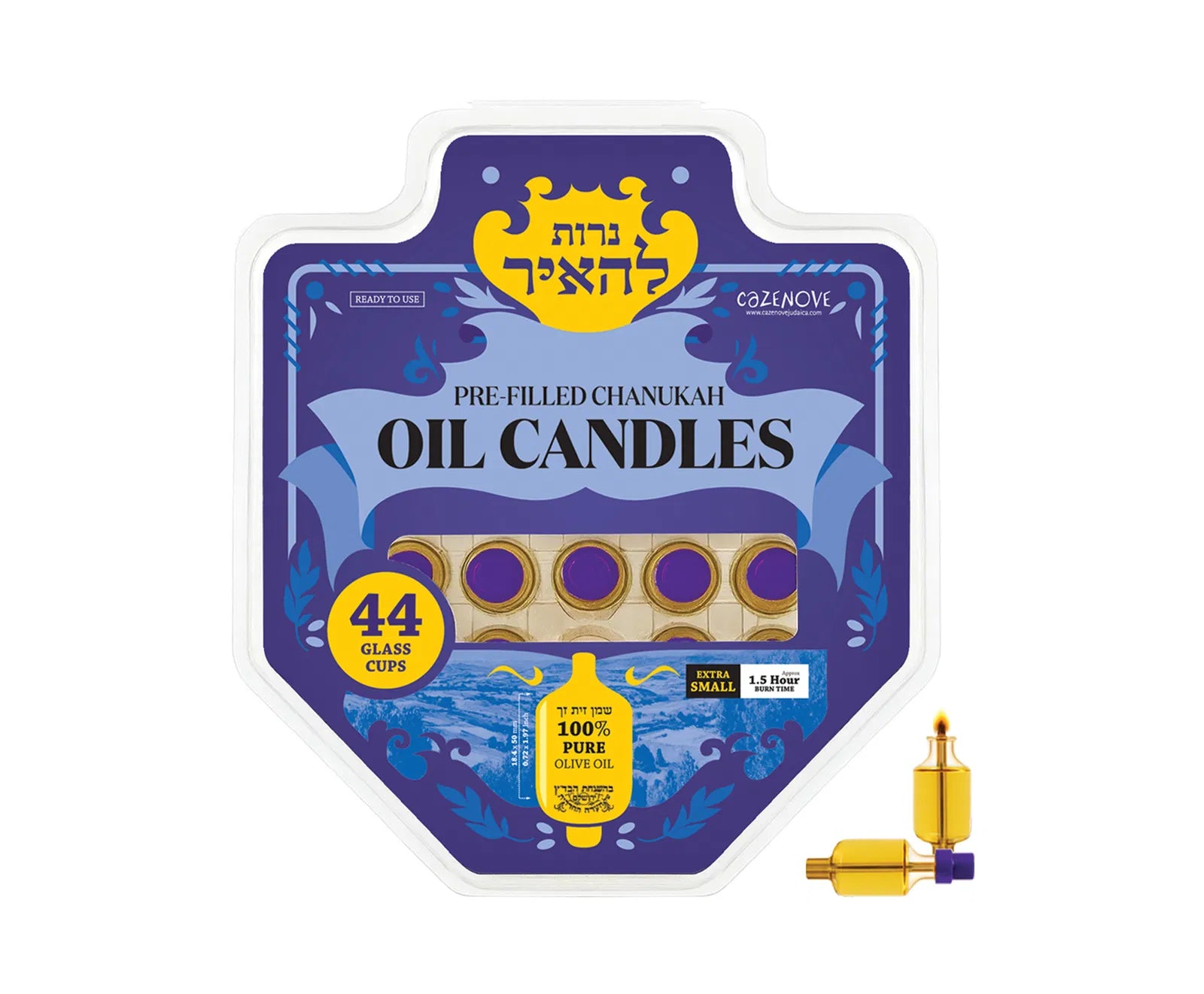 This pack incudes 44 pre filled Chanukah oil glass cups made with 100% pure olive oil. Just remove rubber cap and light. Package also includes brachos card and disposable menorah.