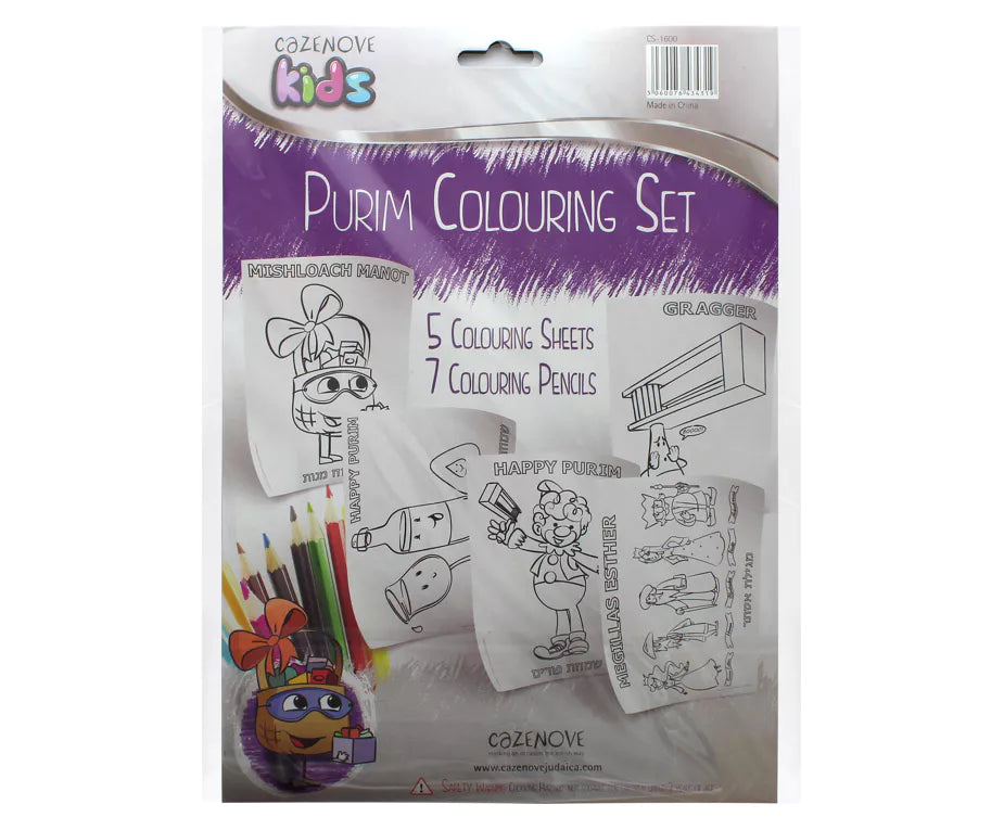 This Purim Colouring Set is the perfect gift for any child. It includes 5 Purim themed colouring sheets as well as 7 colouring pencils to make the images come to life. Great for play, education, birthday parties... etc.