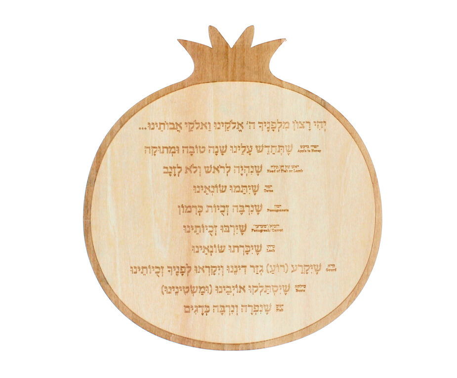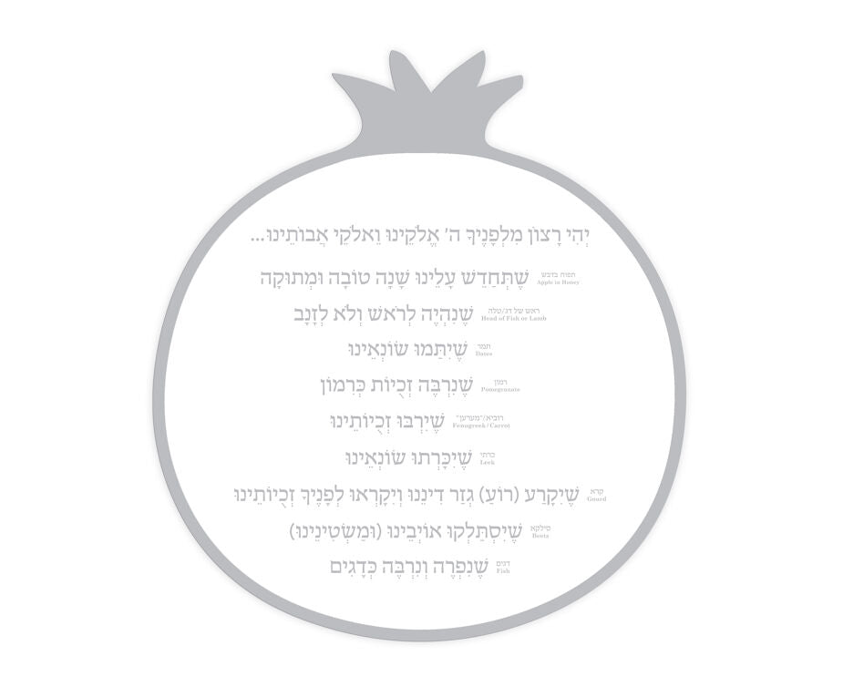 Pomegranate shaped Rosh Hashanah Simanim card is the perfect way to enhance your holiday table making it simple for each member of your family to follow along clearly and easily. The perfect way to follow Prayers for customary foods eaten during the Rosh Hashanah festival.